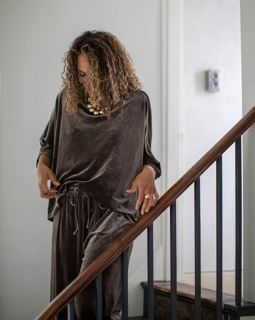 Erin is the ultimate floaty lounge top — soft, swingy, and effortlessly relaxed. Made from plush velour, it features a wide boxy cut, round neckline, and three-quarter length sleeves finished with a gentle cuff.