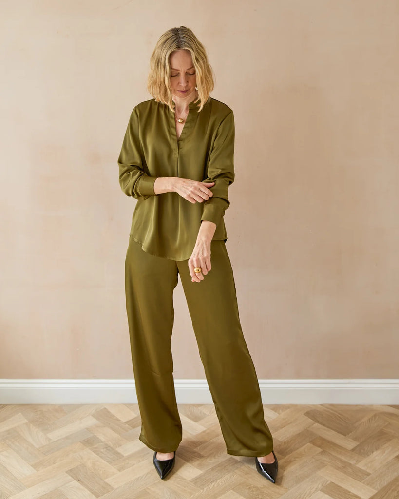 Josie is a sleek satin shirt with a subtle V-neck and long sleeves. Its neat, tailored shape adds effortless elegance—perfect for layering or wearing on its own for a polished look.