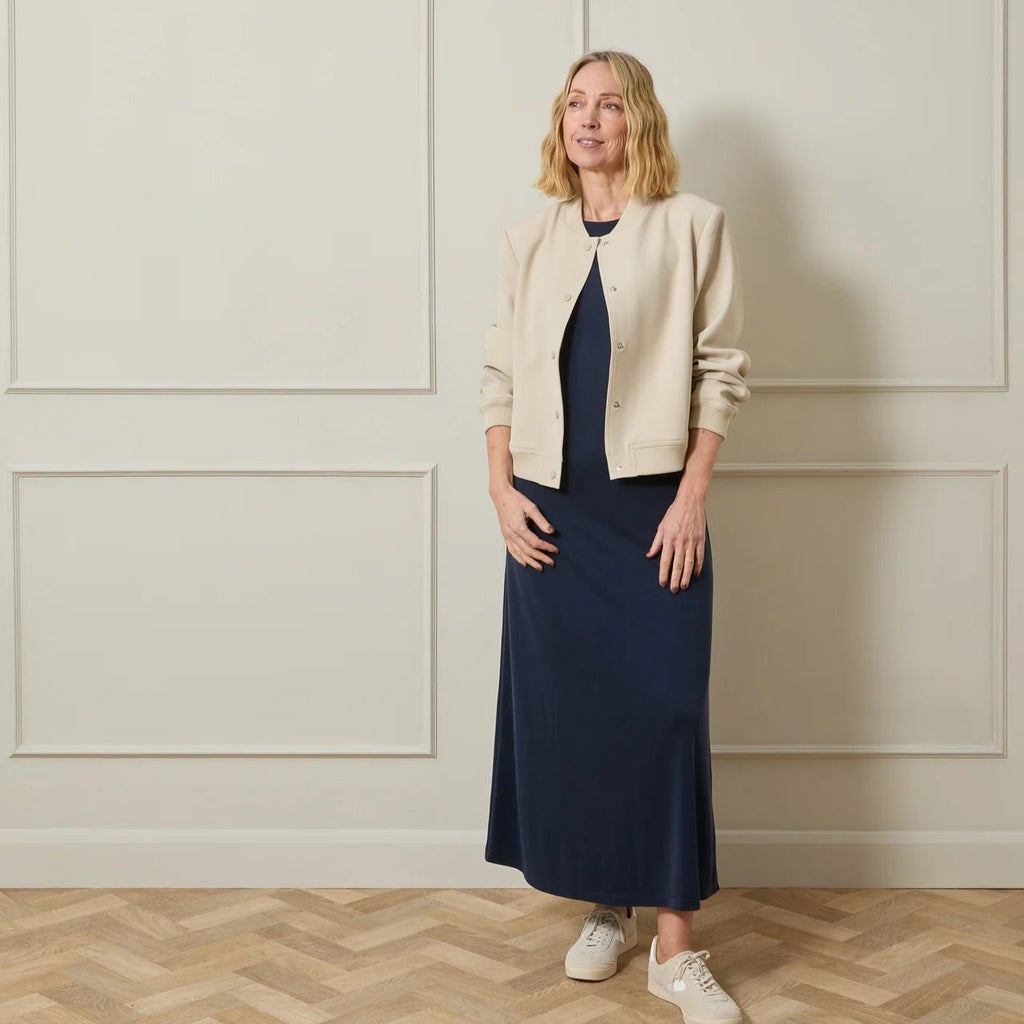 The Tina jacket combines smart, bomber-style with a relaxed fit. Featuring structured shoulder pads and jersey cuffs, this jacket balances sharp design with comfort. The front buttons up neatly, while side pockets add practicality to this stylish piece. Fully lined.
