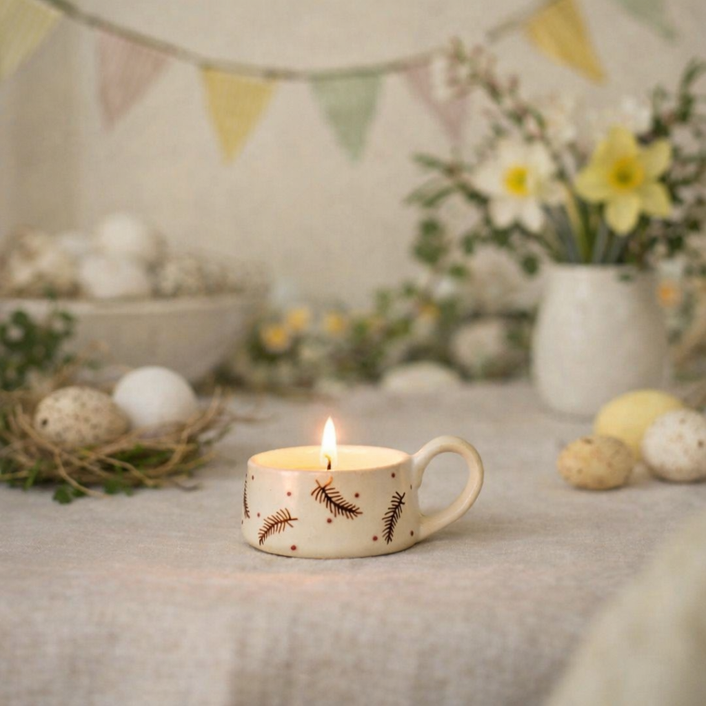 Crafted with a matte cream glaze and hand painted feather, each ceramic tea light holder brings a gentle seasonal touch. Suited to autumn/winter gifting collections, tabletop displays and seasonal homeware edits.