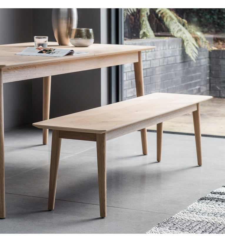 The Dining Bench features a beautiful inlay chevron design, and is made using European oak and rustic oak structured veneers which show the natural beauty of the oak grain and knots. Finished in a specialist mat lacquer, which keeps the timber looking natural and dry, with brushed out grain, the range is tactile to touch and looks amazing.