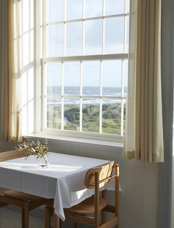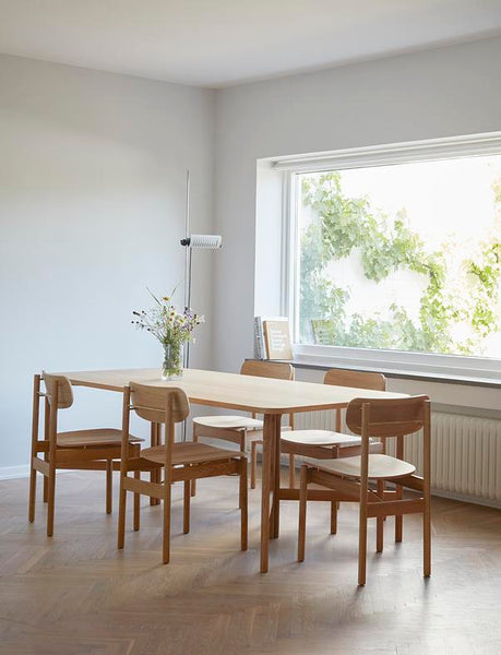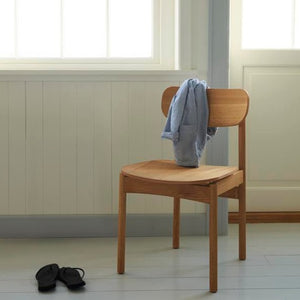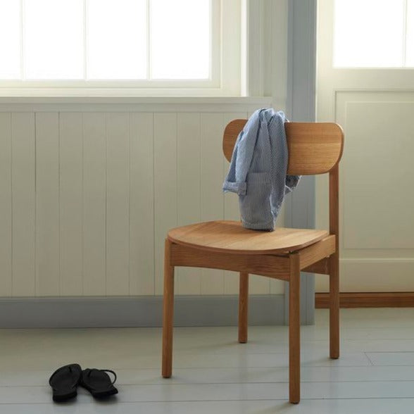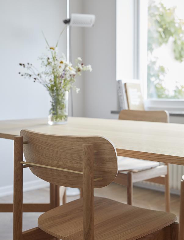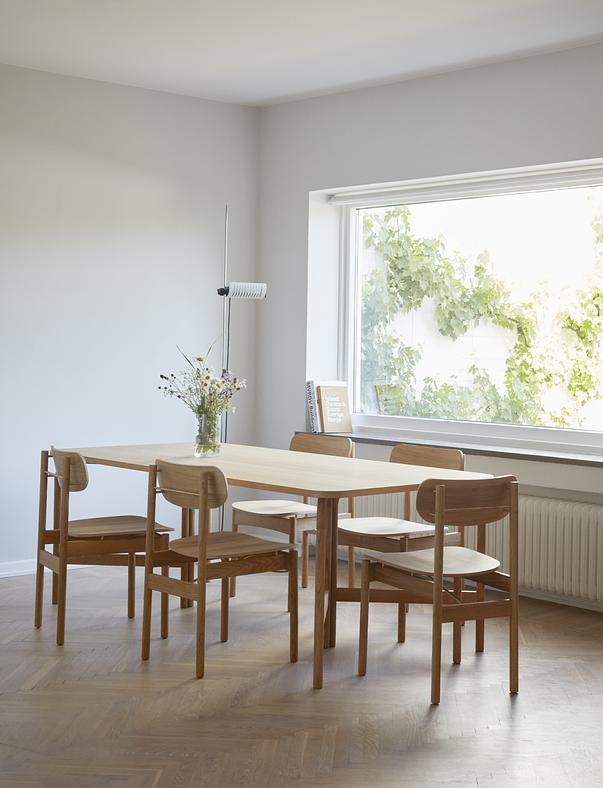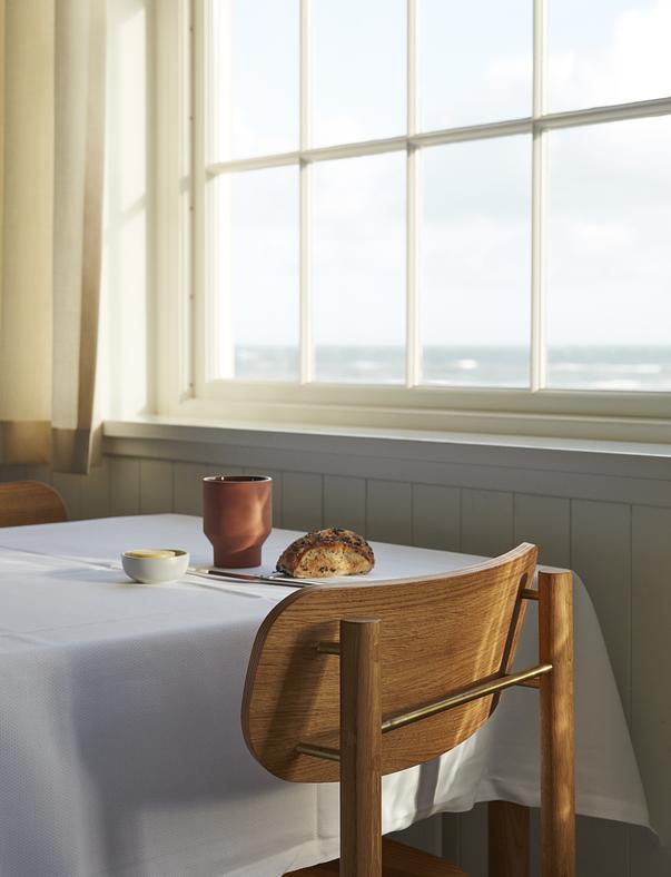 A transverse brass rod that indicates where you pull out the chair. Legs that continue up into the backrest and becomes a small hook, where you can hang your purse. A body in golden oiled oak that naturally contrasts the details in brass. A dining chair designed in a well-proportioned idiom, making it a comfortable seat. Vester Chair is elegant in a discreet way and understated without losing its momentum. Vester Chair is developed and produced by Skagerak for the seaside hotel, Svinkløv Badehotel.