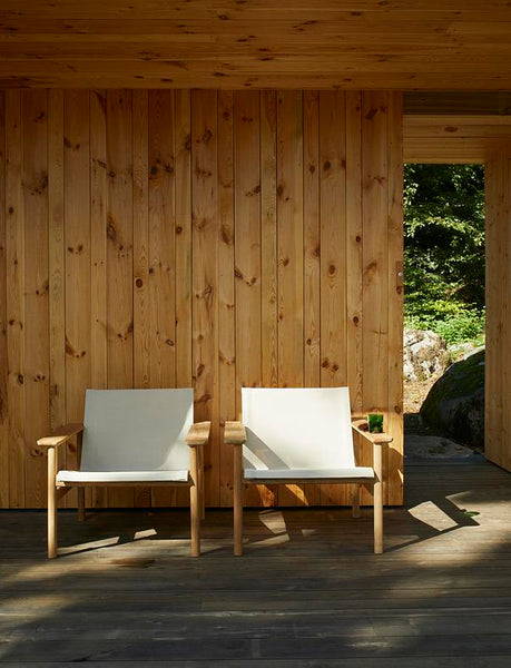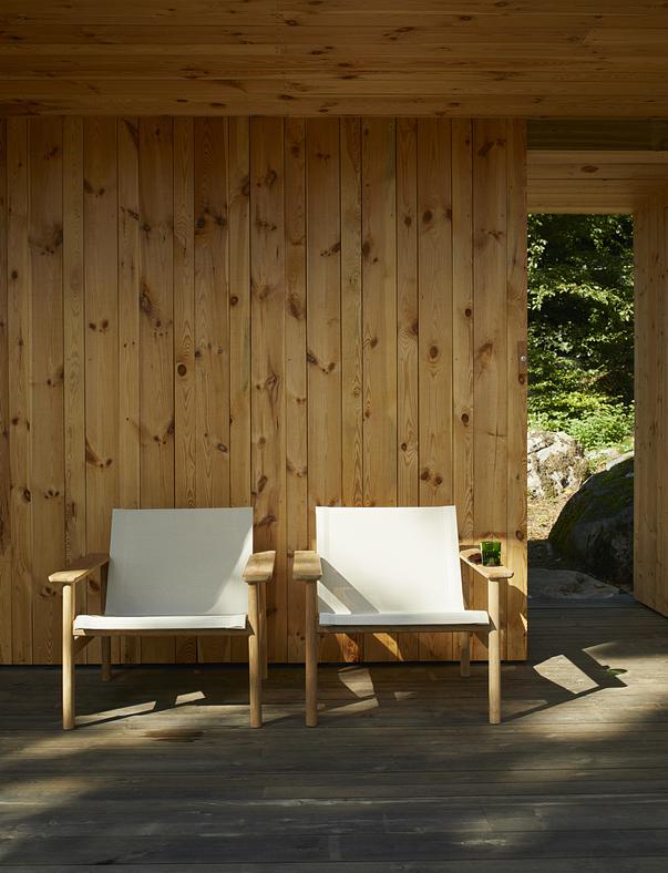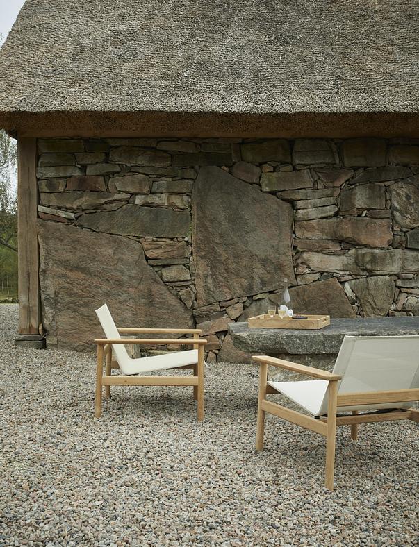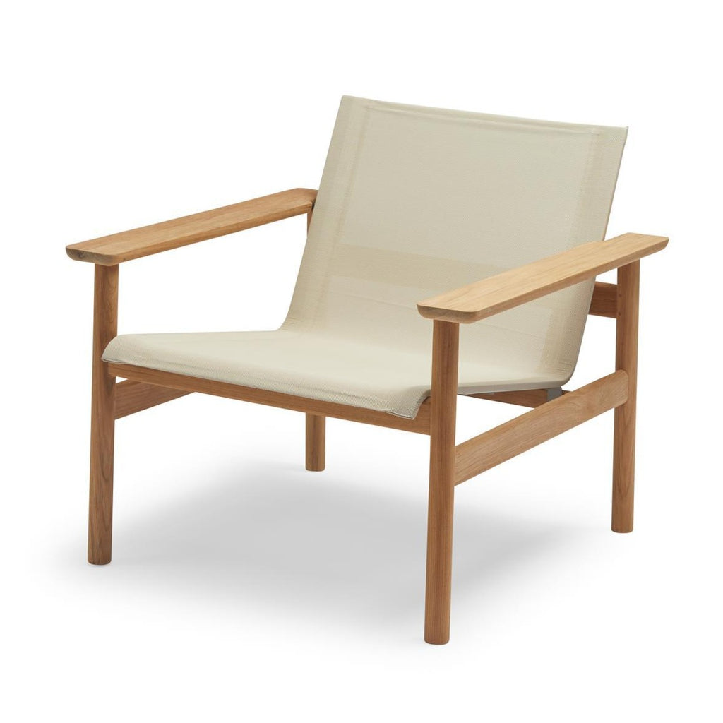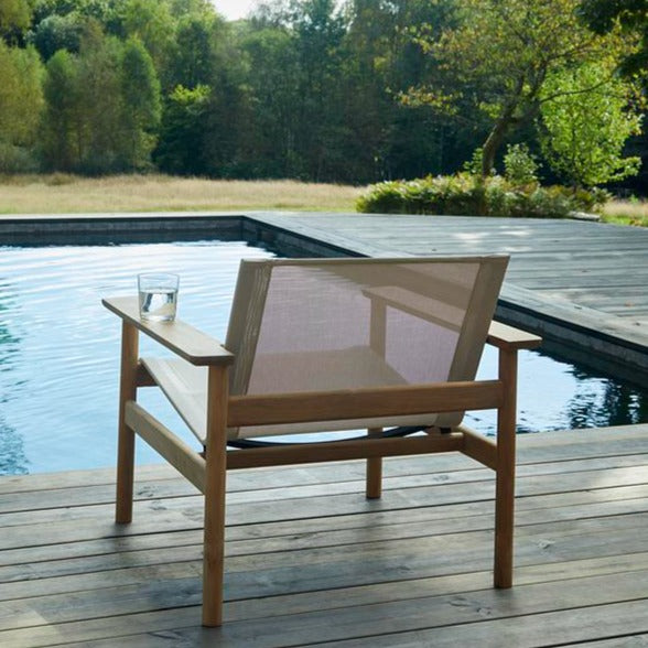 Pelagus collection is a series with a graceful contemporary expression. Pelagus Lounge Chair is designed for laidback days of sun and sociability. At home on a leafy porch or by the pool on a hotel terrace. The lounge chair has a solid teak frame that evokes a classic Scandinavian typology while the weatherproof Sling fabric seat brings a modern edge with its lightness and transparency. The angle of the seat is perfectly reclined for whiling away the hours and the wooden armrests are wide enough for a drink or a book.