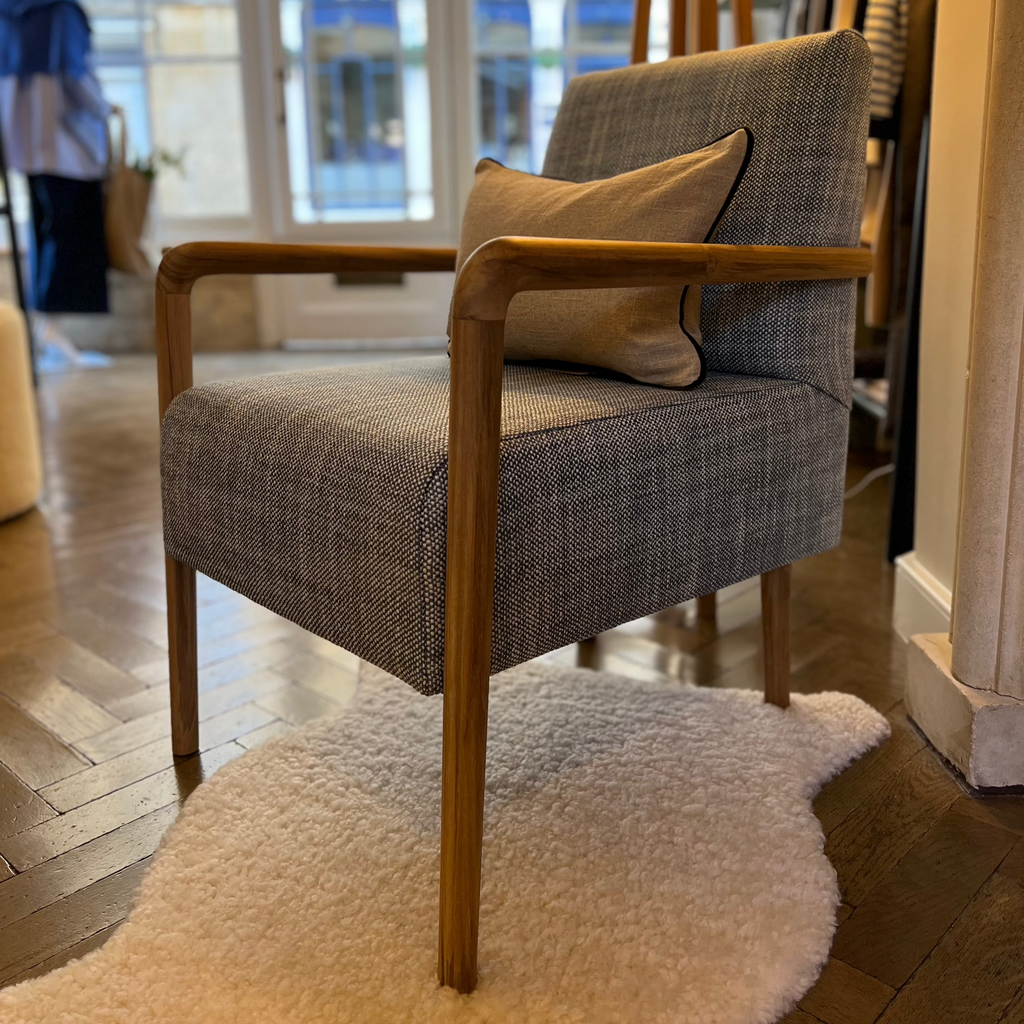 Our most popular and versatile chair to date. The welcoming fixed upholstery is enhanced by the tactile nature of the curved wooden arms. Easily housed in many places in the home. With it's un-cumbersome shape and size, its ideal as the extra chair in the living room. Pair them up by the fireside, for a simply Scandi look.