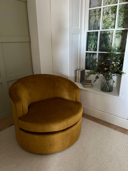 Designed by us at Salcombe Trading. Named after the iconic Crescent in the beautiful city of Bath. This curvaceous range offers the ultimate in luxury and homely roundness. Upholstered in sumptuous Ochre Velvet fabric, this will slot into a heavenly neutral scheme, or brighten up a darker room.