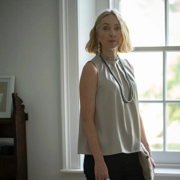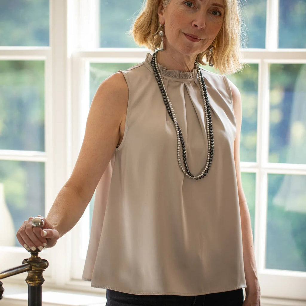 Imogen is a sleeveless, gathered neckline top, in drapey satin. Designed with a key hole button back and pinch pleat fullness in front. This top is a simple, yet beautifully designed addition to add to your winter wardrobe. Perfect for party wear, slip under a jacket for day to night styling.