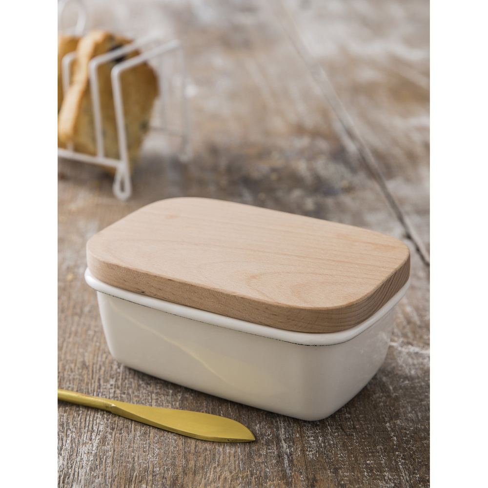 Keep butter stored fresh and secure in the Butter Dish with Wooden Lid. Designed to fit a 250g block of butter, the dish can be placed on your kitchen worktop or in the fridge, ready for breakfasts or a spot of baking.