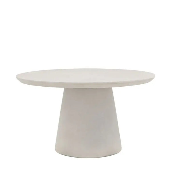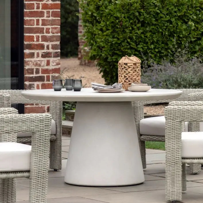 This outdoor table features a smooth, round top paired with a tapered pedestal base. Crafted from high-quality, reinforced concrete, it’s engineered to endure the elements and offer long-lasting durability. The table’s modern aesthetic brings a charm to any patio, garden, or terrace. Whether you’re hosting guests for dinner or enjoying a quiet afternoon in the sun, this table serves as the perfect centerpiece for entertaining or simply unwinding in style.