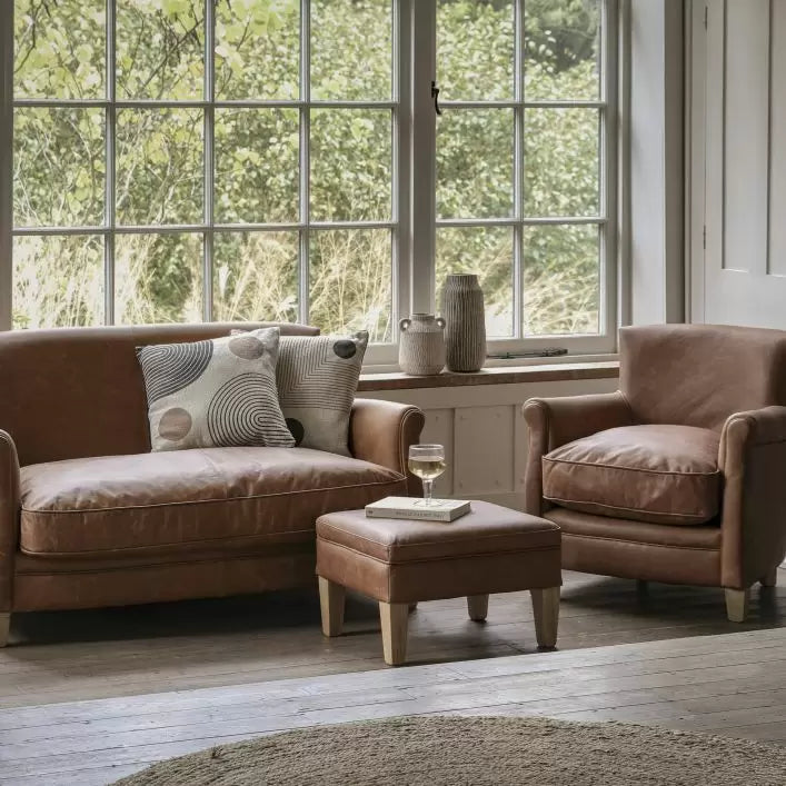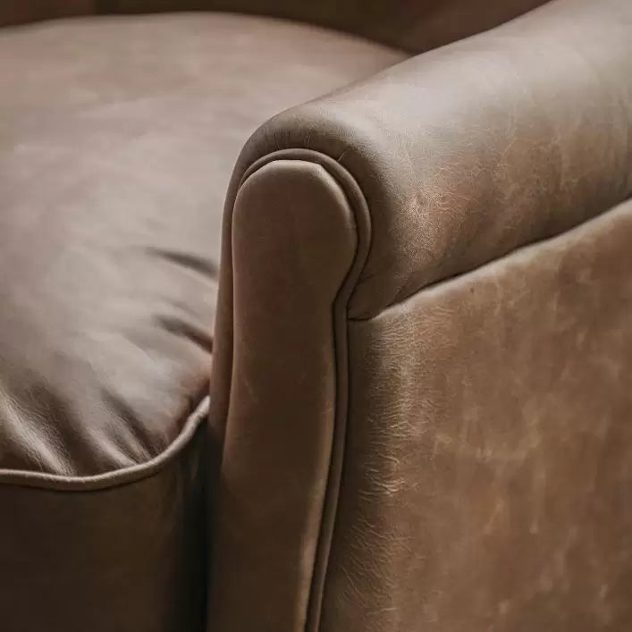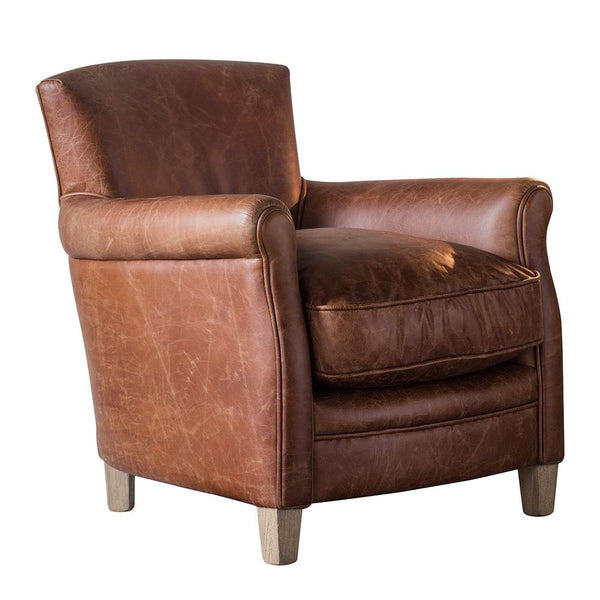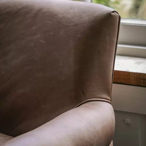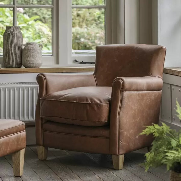 Sink into this gorgeous genuine leather armchair. It’s a way to bring leather into your home as an elegant accent rather than a bigger feature. Upholstered in a beautiful vintage brown leather, this classic chair will give a natural element to any interior, traditional or contemporary.