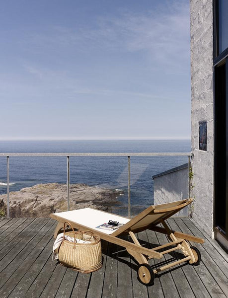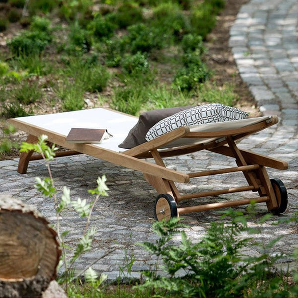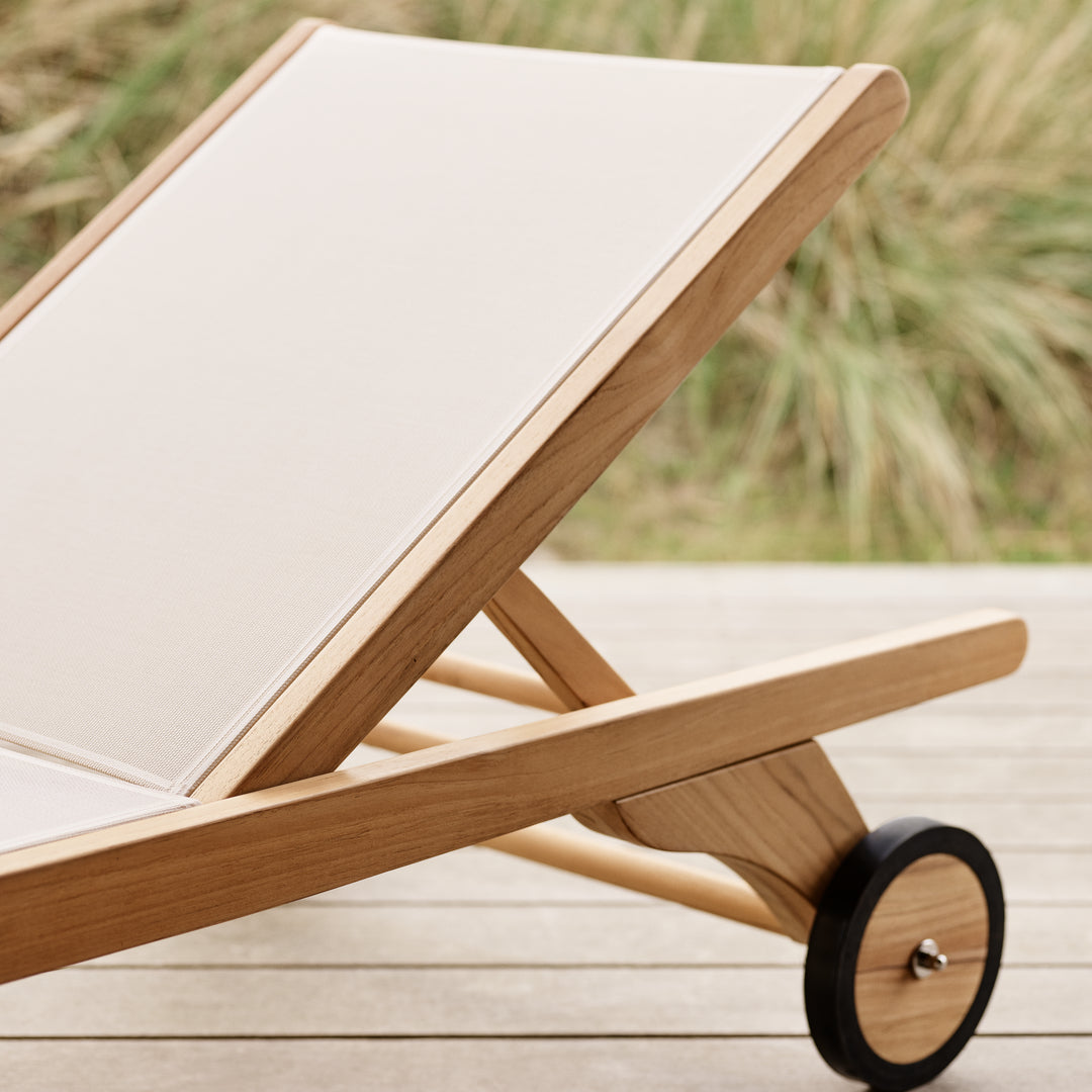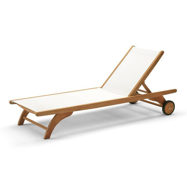 A super comfortable and versatile sun lounger made from 100% FSC teak and hardwearing fabric in either black or white. With its two wheels, the Columbus sun lounger is easy to move around and the backrest is adjustable in several positions.