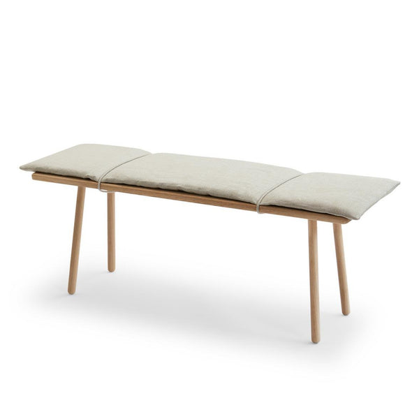 Have a seat on Georg Bench and experience the exquisite meeting between Nordic sensuality and Japanese minimalism. Georg’s DNA is characterized by its slender wooden poles and rounded edges – crafted from light FSC-certified Oak. A leather strap keeps the soft, woolen cushion in place on the seat, fulfilling the material encounter of textile, skin and wood.