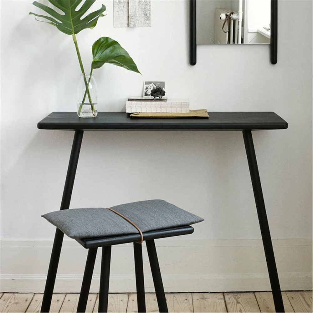 A two-legged console table fitted against the wall taking up as little space as possible. Georg console desk is a functional piece suited for most rooms: As a welcoming station in the hallways where you can drop off keys and phones. As a make-up vanity in the bedroom or as a minimalist TV stand in the living room. Georg's DNA is a fusion of Nordic and Japanese inspiration with slender rounded wooden poles – crafted from light FSC-certified Oak.