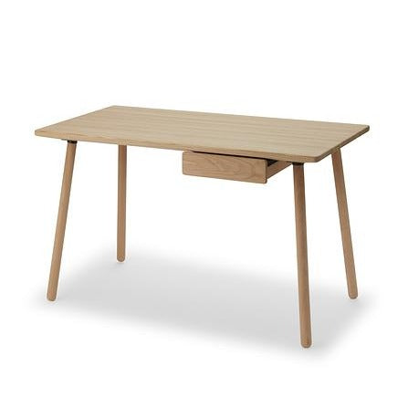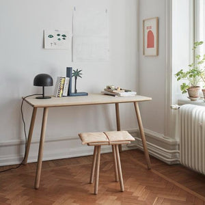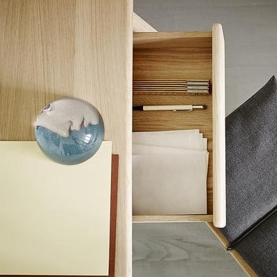 Georg is a desk that doesn’t brag about size. Georg is big enough without taking up more room than necessary. The desk comes with the possibility of adding a drawer module on the left or right side under the tabletop. Georg’s DNA is characterised by its slender wooden poles and rounded edges – crafted from light Oak.