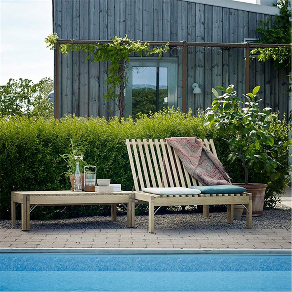 Riviera Lounge is based on the original Riviera Sunbed, which can expand in length. Here, the expansion is not in length but in width, enabling the lounge elements to serve as a chair and table, a sofa or a level surface that will serve as a bed.