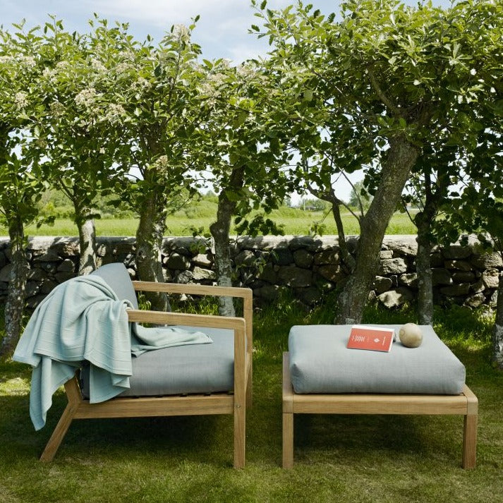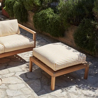 Virkelyst Pouf is a modern outdoor pouf with the seating comfort of an indoor furniture. The simple wooden frame strikes a contrast with the thick, soft cushion. The upholstery is Oeko-Tex certified and extremely colour- and lightfast, water- and dirt-repellent and mildew-resistant. With a cold foam filling the cushion provides a firm and comfortable support. The textile and foam are FR treated and approved for UK markets.